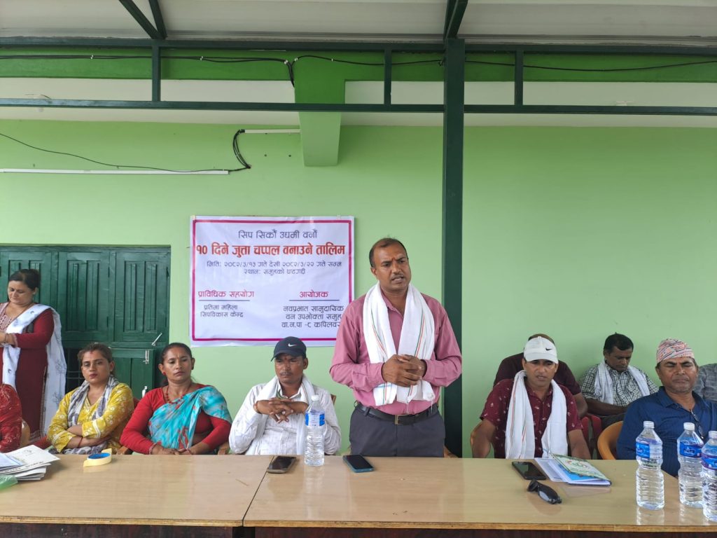 पशुपति गिरी,बाणगंगा, कपिलवस्तु । “सीप सिकौं, उद्यमी बनौं” भन्ने मूल नारासहित बाणगंगा नगरपालिका वडा नं. ८ मा रहेको नव प्रभात सामुदायिक वन उपभोक्ता समूहको आयोजनामा १० दिने जुत्ता–चप्पल बनाउने तालिम आज शुक्रबारदेखि सुरु भएको छ। तालिम नव प्रभात सामुदायिक वनको कार्यालयमा संचालन गरिएको हो।