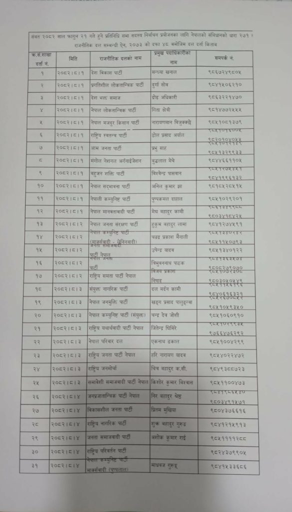 नेपाली कांग्रेस, नेपाली कम्युनिस्ट पार्टी, राष्ट्रिय स्वतन्त्र पार्टीलगायत प्रमुख राजनीतिक दलले दल दर्ता गराइसकेका छन् भने नेकपा एमालेले भने अझै दल दर्ता गराइसकेको छैन ।