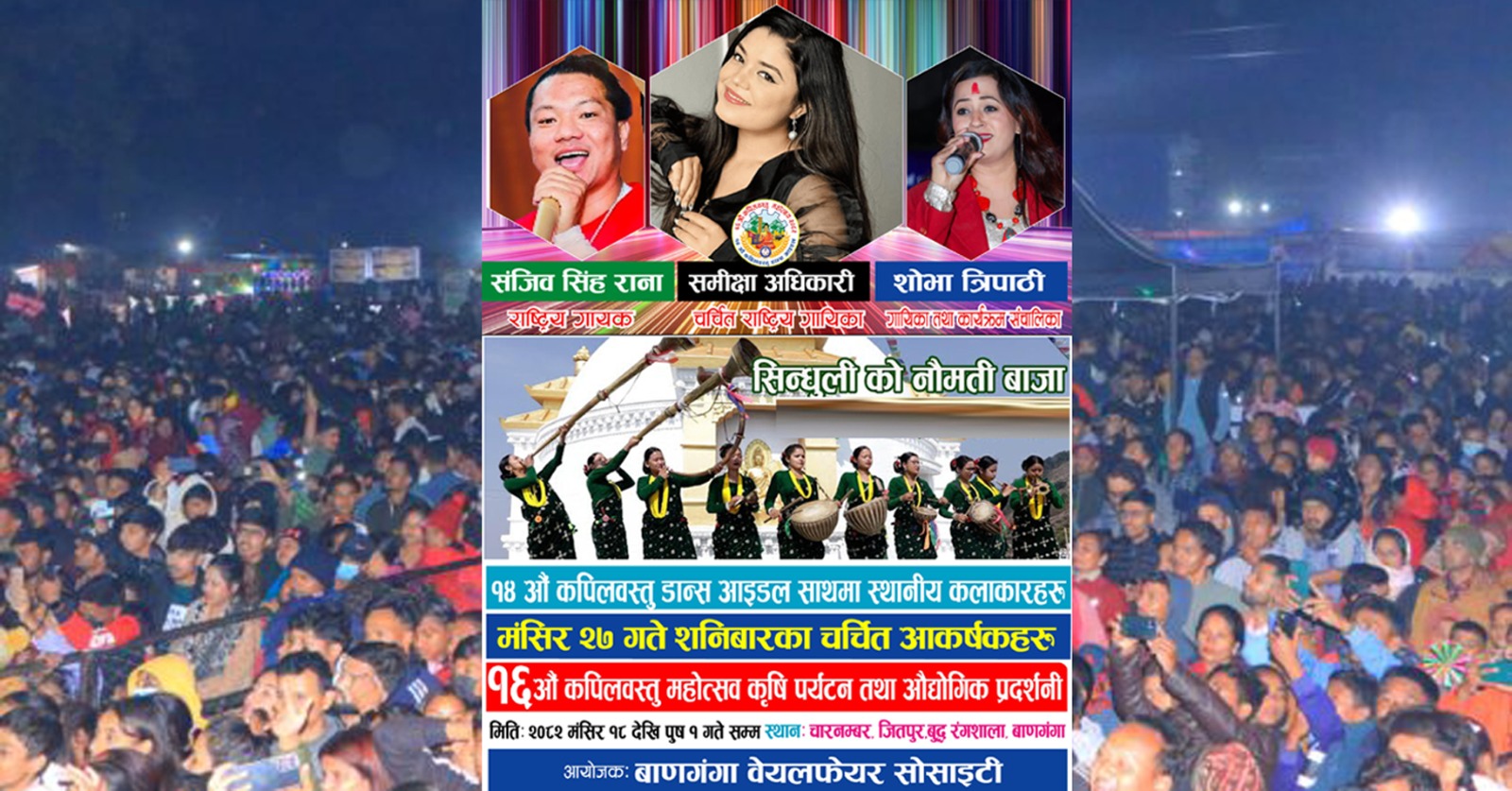 बाणगंगा । कृषि, उद्योग, पर्यटन तथा खेलकुदमा लगानी युवाको हातमा सुनौलो विहानी भन्ने मूल नाराका साथ मंसिर १८ गतेदेखि बाणगंगा स्थित बुद्ध रंगशालामा बाणगंगा वेयलफेयर सोसाइटीको आयोजनामा सुरु भएको १६औं कपिलवस्तु महोत्सव, कृषि पर्यटन तथा औद्योगिक प्रदर्शनीले चारनम्बरको बुद्ध रंगशाला दर्शकको उत्साहजनक उपस्थितिले उत्सवमय बन्दै गएको छ ।